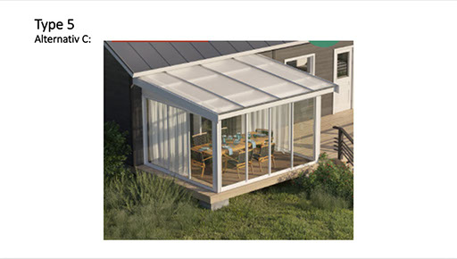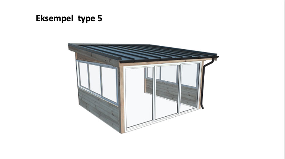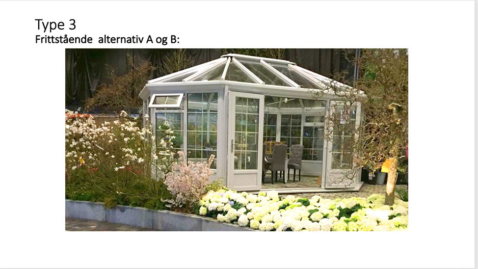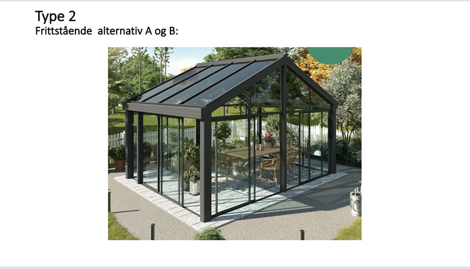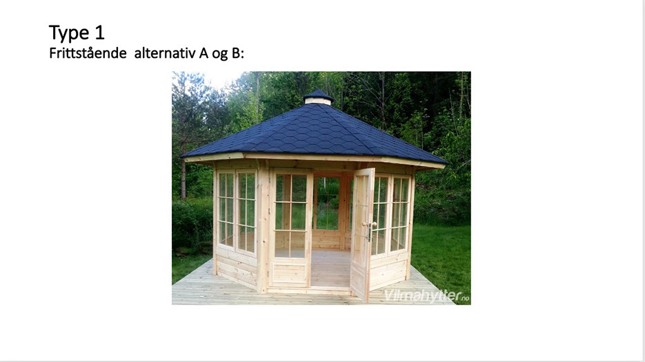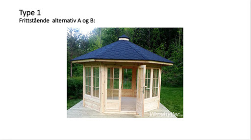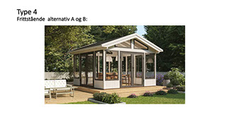 Av typer er det forskjellige typer av frittstående bygg og en type hvor utestua kobles opp mot garasjeveggen.