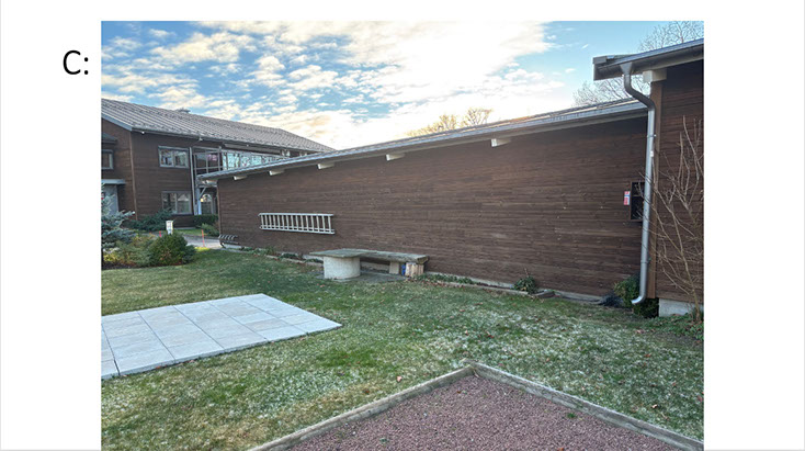 Det gjelder gjerde mot Kaupangveien, forlengelse av gangvei fra bygg2 til møterommet og felling av tuntreet mot at det plantes et nytt tuntre lenger unna bygg1